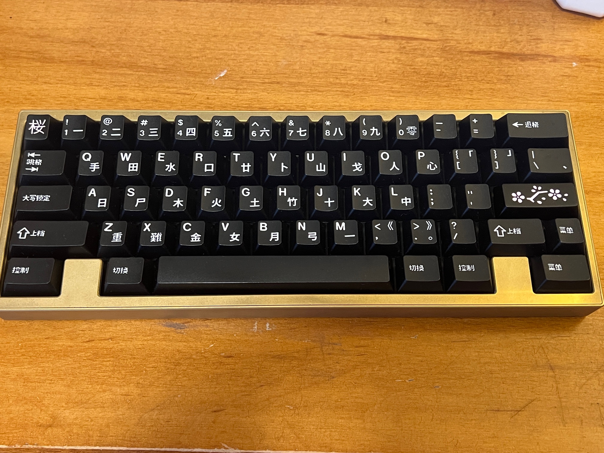 Private GB, full brass version of the Ciel60 board. Built with vint blacks on alu. Includes GMK Shanshui base set and 2 artisans.